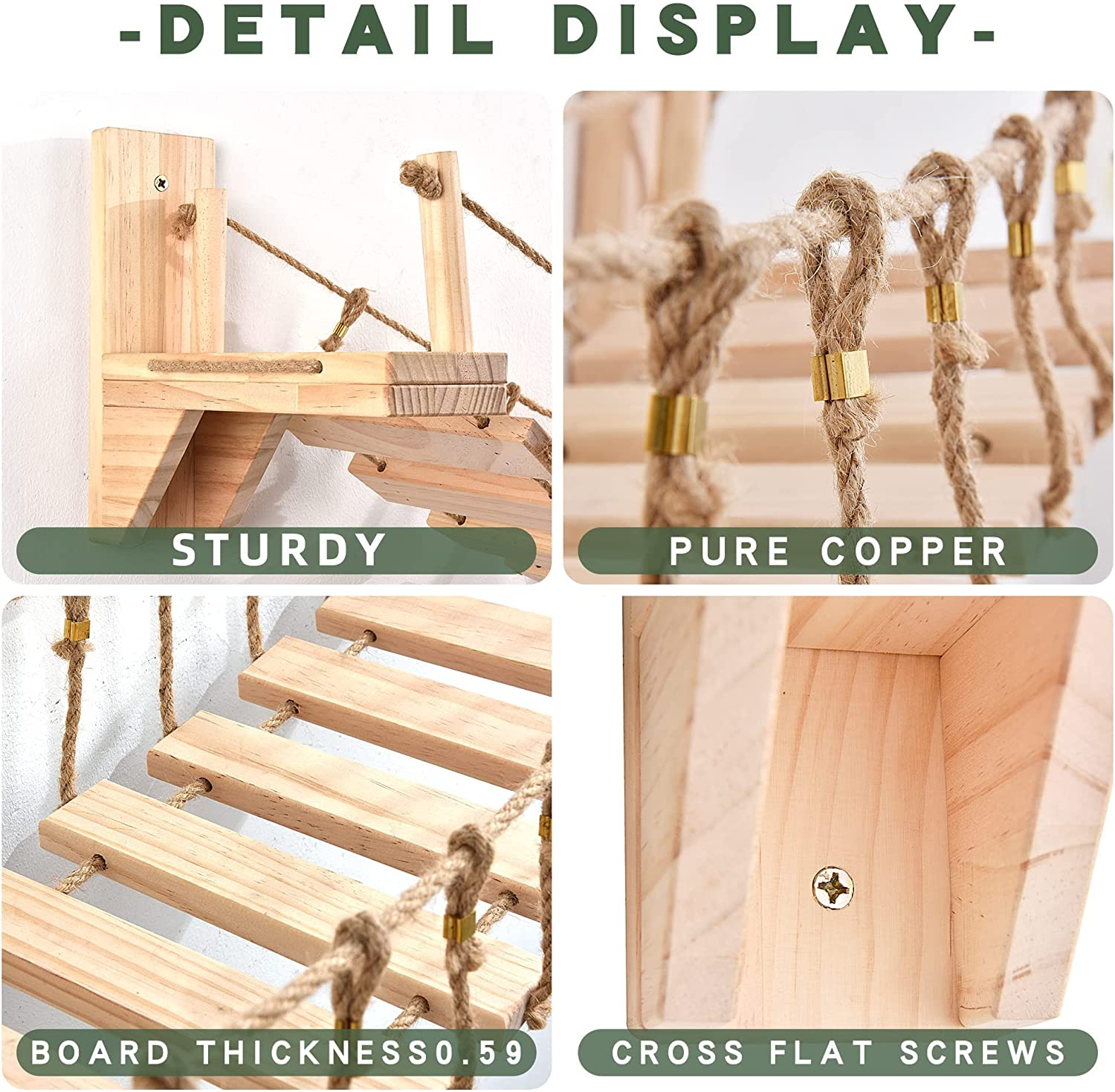 Cat bridge length in three sizes available from 43.31-59.05″. It support can hold 30 LB (Actual load-bearing capacity also depends on whether you install it correctly).