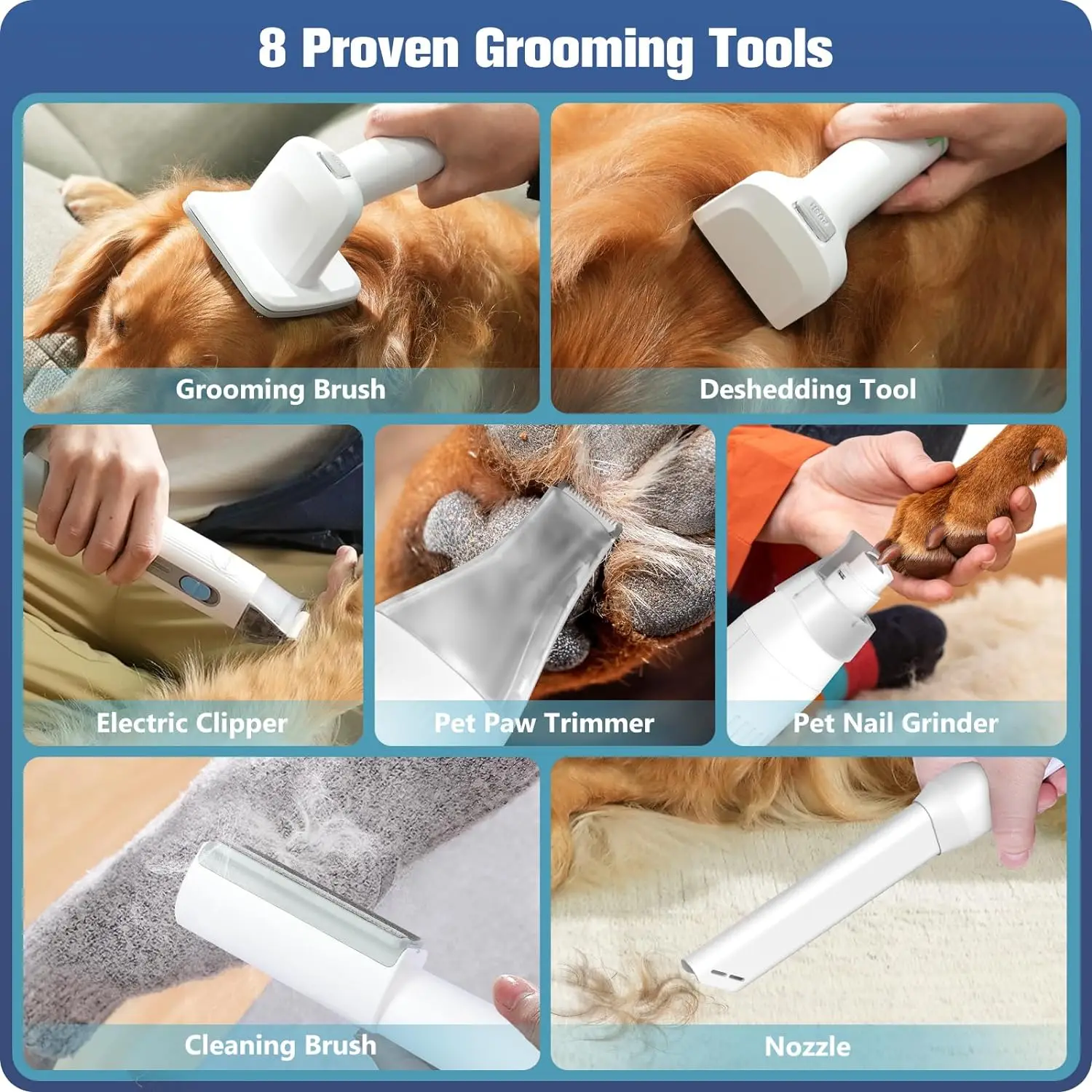 - 🐱【Professional Pet Salon at Home】Our dog hair vacuum comes with 8 proven tools: grooming brush and de-shedding brush help to promote a sleek and healthier hair; electric hair clipper with 6 guard combs to do the haircut; paw trimmer helps to delicate areas; nail grinder to polish nails. Nozzle head and cleaning brush can be used for collecting hair on sofa, gap, carpet and floor.